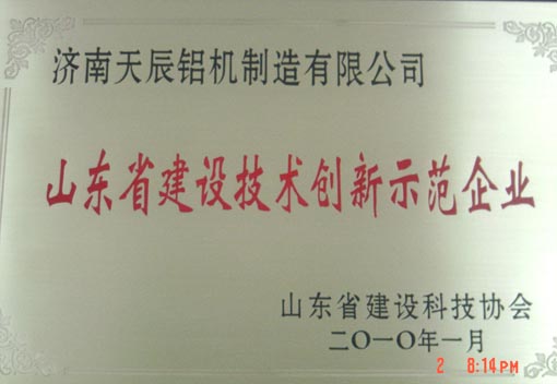 ??? 2010年2月26日山東省住房和城鄉建設廳在濟南南郊賓館召開全省建設科技工作會議,隆重表彰了全省建設科教工作和墻材革新建筑節能工作先進集體、先進個人,省建設技術創新獎評獎結果和省建設技術創新示范企業、建筑節能優秀示范工程名單。天辰鋁機公司獲省建設技術創新示范企業。